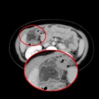• Solitary large nonenhancing omental mass with heterogeneous attenuation