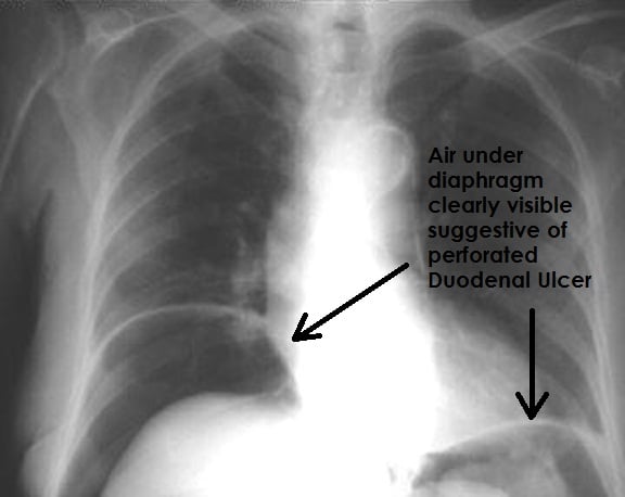 If a peptic ulcer perforates, air will leak from the inside of the gastrointestinal tract to the peritoneal cavity. This leads to “free gas” within the peritoneal cavity. If the patient stands erect, as when having a chest X-ray, the gas will float to a position underneath the diaphragm. Therefore, gas in the peritoneal cavity, shown on an erect chest X-ray or supine lateral abdominal X-ray, is an omen of perforated peptic ulcer disease.